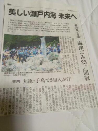 7月5日海洋ゴミ削減に取り組む「瀬戸内海オーシャンズX」を核に香川、愛媛、広島、岡山の4県合わせて930人のボランテアーの方々が25トンのゴミ回収をしました。香川県では丸亀港からチャーター便に乗船した家族連れや中高生や企業関係者240名が丸亀沖の手島西浦海岸に着岸しました。1時間ほどの活動で3.1トンのペットボトルや発砲スチールなどの漂着ゴミを汗だくだくで大きなゴミ袋に入れていきました。丸亀市が4県のメイン会場になりオンラインで他県とも繋いで開会式が行われ各県知事も参加され「頑張るぞ!!」の掛け声とともに現場に出発した。この企画は今後3年間続けられますので、今回参加できなかった方々は是非次回の参加をお待ちしています。